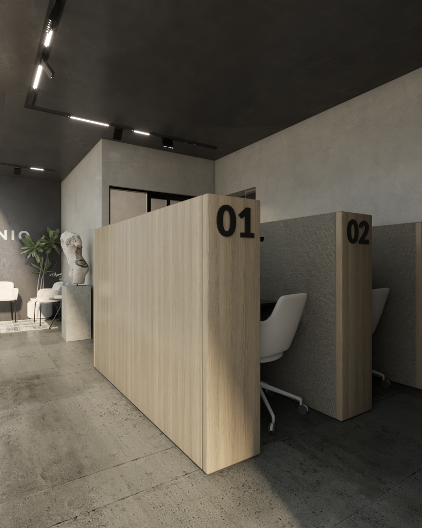 El concepto de este proyecto se basa en una temática industrial y minimalista, para lograrlo se optó por pocos acabados y texturas, utilizando acabado de concreto pulido en muros y pisos, detalles de madera en el área de barra y cubículos.